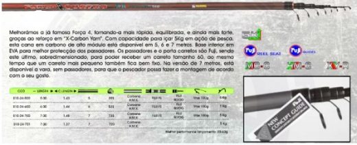 Melhoramos a já famosa Força 4, tornando-a mais rápida, equilibrada e ainda mais forte, graças ao reforço em “X-Carbon Yarn”. Com capacidade para içar 5kg em ação de pesca, esta cana em carbono de alto módulo está disponível em 5, 6 e 7 metros.