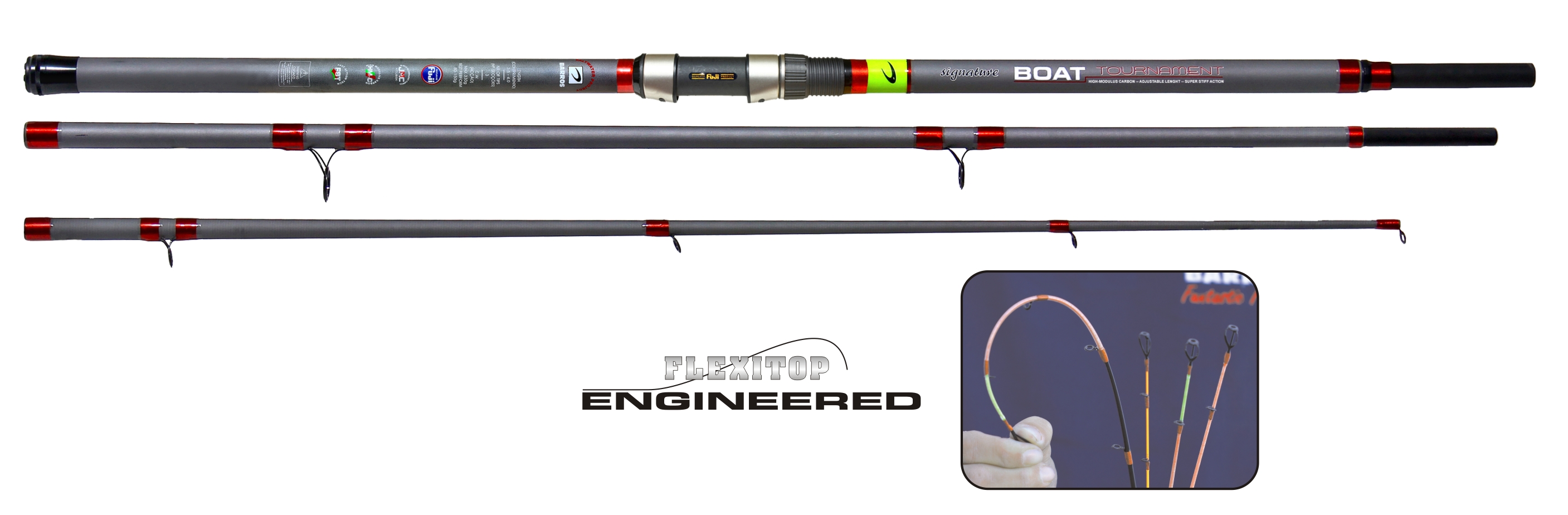 Fruto de um longo trabalho no terreno, a nossa equipa de engenheiros em parceria com os nossos consultores para a área da pesca embarcada, chegaram a esta cana extraordinária, concebida para a pesca de alta competição. Temos uma cana extremamente leve, com ação exclusivamente de ponta, capaz de projetar chumbadas de peso considerável. Ajustável no cabo e equipada com 4 ponteiras (3 de fibra e 1 de carbono), duas delas são curtas e muito cónicas, especialmente indicadas para lançar chumbadas pesadas, sendo ao mesmo tempo, muito sensíveis. As ponteiras de fibra maciça fabricadas com o novo sistema FLEXITOP, permitem uma superior flexibilidade e resistência na ponta com uma